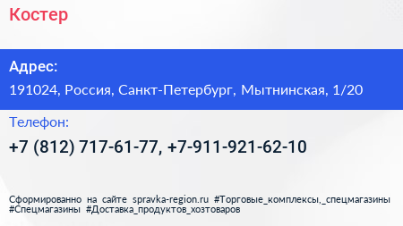 Костер по адресу 191024, Россия, Санкт-Петербург, Мытнинская, 1/20 в дальнейшем Организация, размещена в следующих категориях: