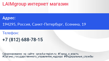 LAIMgroup, интернет-магазин по адресу 194295, Россия, Санкт-Петербург, Есенина, 19 в дальнейшем Организация, размещена в следующих категориях: