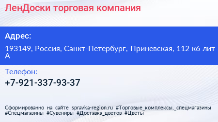 ЛенДоски, торговая компания по адресу 193149, Россия, Санкт-Петербург, Приневская, 112 к6 лит А в дальнейшем Организация, размещена в следующих категориях: