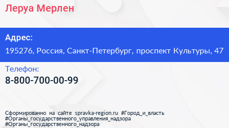 Леруа Мерлен по адресу 195276, Россия, Санкт-Петербург, проспект Культуры, 47 в дальнейшем Организация, размещена в следующих категориях: