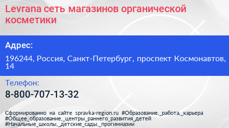 Levrana, сеть магазинов органической косметики по адресу 196244, Россия, Санкт-Петербург, проспект Космонавтов, 14 в дальнейшем Организация, размещена в следующих категориях: