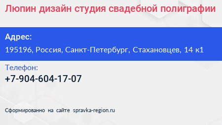 Люпин дизайн, студия свадебной полиграфии по адресу 195196, Россия, Санкт-Петербург, Стахановцев, 14 к1 в дальнейшем Организация, размещена в следующих категориях: