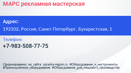 МАРС, рекламная мастерская по адресу 192102, Россия, Санкт-Петербург, Бухарестская, 1 в дальнейшем Организация, размещена в следующих категориях: