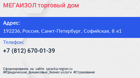 МЕГАИЗОЛ, торговый дом по адресу 192236, Россия, Санкт-Петербург, Софийская, 8 к1 в дальнейшем Организация, размещена в следующих категориях:
