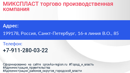 МИКСПЛАСТ, торгово-производственная компания по адресу 199178, Россия, Санкт-Петербург, 16-я линия В.О., 85 в дальнейшем Организация, размещена в следующих категориях: