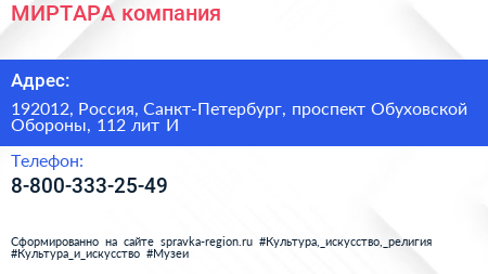 МИРТАРА, компания по адресу 192012, Россия, Санкт-Петербург, проспект Обуховской Обороны, 112 лит И в дальнейшем Организация, размещена в следующих категориях: