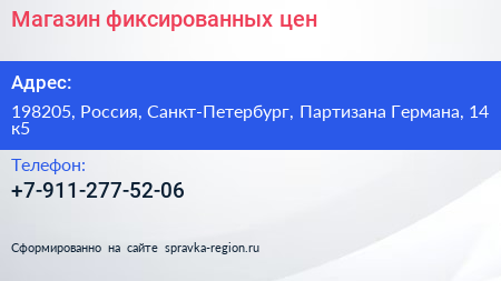 Магазин фиксированных цен по адресу 198205, Россия, Санкт-Петербург, Партизана Германа, 14 к5 в дальнейшем Организация, размещена в следующих категориях: