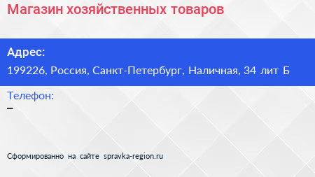 Магазин хозяйственных товаров по адресу 199226, Россия, Санкт-Петербург, Наличная, 34 лит Б в дальнейшем Организация, размещена в следующих категориях:
