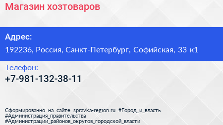 Магазин хозтоваров по адресу 192236, Россия, Санкт-Петербург, Софийская, 33 к1 в дальнейшем Организация, размещена в следующих категориях: