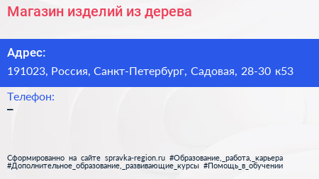 Магазин изделий из дерева по адресу 191023, Россия, Санкт-Петербург, Садовая, 28-30 к53 в дальнейшем Организация, размещена в следующих категориях: