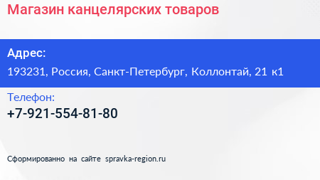 Магазин канцелярских товаров по адресу 193231, Россия, Санкт-Петербург, Коллонтай, 21 к1 в дальнейшем Организация, размещена в следующих категориях: