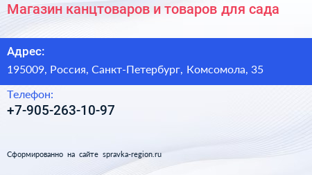 Магазин канцтоваров и товаров для сада по адресу 195009, Россия, Санкт-Петербург, Комсомола, 35 в дальнейшем Организация, размещена в следующих категориях: