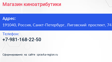 Магазин киноатрибутики по адресу 191040, Россия, Санкт-Петербург, Лиговский проспект, 74 в дальнейшем Организация, размещена в следующих категориях: