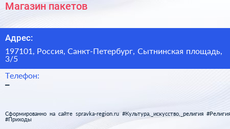 Магазин пакетов по адресу 197101, Россия, Санкт-Петербург, Сытнинская площадь, 3/5 в дальнейшем Организация, размещена в следующих категориях: