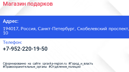 Магазин подарков по адресу 194017, Россия, Санкт-Петербург, Скобелевский проспект, 10 в дальнейшем Организация, размещена в следующих категориях: