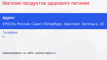 Магазин продуктов здорового питания по адресу 194156, Россия, Санкт-Петербург, проспект Энгельса, 21 в дальнейшем Организация, размещена в следующих категориях: