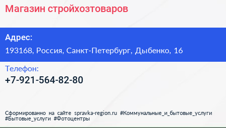 Магазин стройхозтоваров по адресу 193168, Россия, Санкт-Петербург, Дыбенко, 16 в дальнейшем Организация, размещена в следующих категориях: