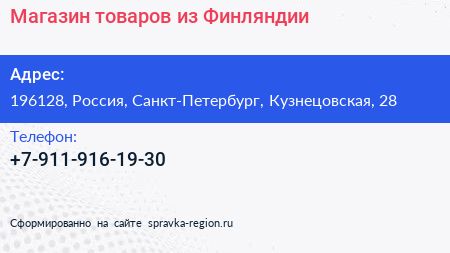 Магазин товаров из Финляндии по адресу 196128, Россия, Санкт-Петербург, Кузнецовская, 28 в дальнейшем Организация, размещена в следующих категориях: