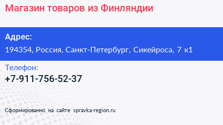 Магазин товаров из Финляндии по адресу 194354, Россия, Санкт-Петербург, Сикейроса, 7 к1 в дальнейшем Организация, размещена в следующих категориях:
