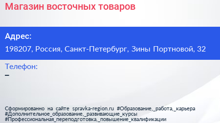 Магазин восточных товаров по адресу 198207, Россия, Санкт-Петербург, Зины Портновой, 32 в дальнейшем Организация, размещена в следующих категориях:
