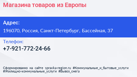 Магазина товаров из Европы по адресу 196070, Россия, Санкт-Петербург, Бассейная, 37 в дальнейшем Организация, размещена в следующих категориях: