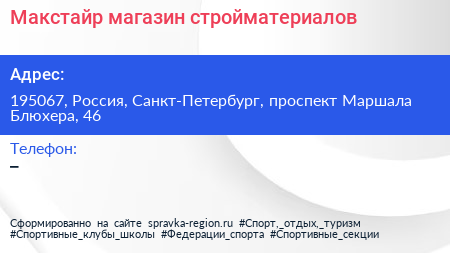 Макстайр, магазин стройматериалов по адресу 195067, Россия, Санкт-Петербург, проспект Маршала Блюхера, 46 в дальнейшем Организация, размещена в следующих категориях: