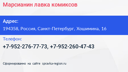 Марсианин, лавка комиксов по адресу 194358, Россия, Санкт-Петербург, Хошимина, 16 в дальнейшем Организация, размещена в следующих категориях: