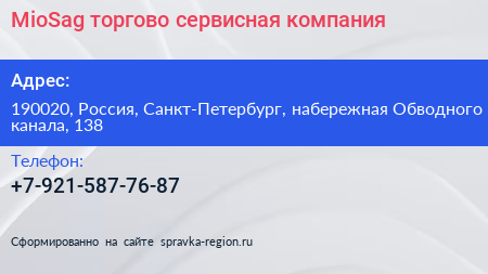 MioSag, торгово-сервисная компания по адресу 190020, Россия, Санкт-Петербург, набережная Обводного канала, 138 в дальнейшем Организация, размещена в следующих категориях: