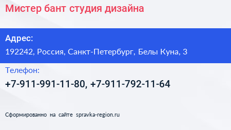 Мистер бант, студия дизайна по адресу 192242, Россия, Санкт-Петербург, Белы Куна, 3 в дальнейшем Организация, размещена в следующих категориях:
