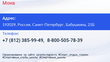 Мона по адресу 192029, Россия, Санкт-Петербург, Бабушкина, 21Б в дальнейшем Организация, размещена в следующих категориях: