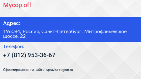 Мусор-off по адресу 196084, Россия, Санкт-Петербург, Митрофаньевское шоссе, 22 в дальнейшем Организация, размещена в следующих категориях:
