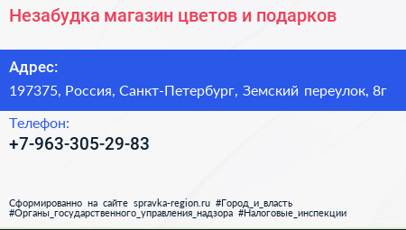 Незабудка, магазин цветов и подарков по адресу 197375, Россия, Санкт-Петербург, Земский переулок, 8г в дальнейшем Организация, размещена в следующих категориях: