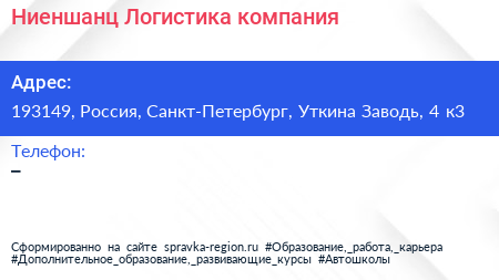 Ниеншанц-Логистика, компания по адресу 193149, Россия, Санкт-Петербург, Уткина Заводь, 4 к3 в дальнейшем Организация, размещена в следующих категориях: