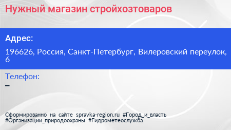 Нужный, магазин стройхозтоваров по адресу 196626, Россия, Санкт-Петербург, Вилеровский переулок, 6 в дальнейшем Организация, размещена в следующих категориях: