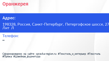 Оранжерея по адресу 198328, Россия, Санкт-Петербург, Петергофское шоссе, 27 Лит Л в дальнейшем Организация, размещена в следующих категориях: