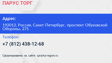 ПАРУС ТОРГ по адресу 192012, Россия, Санкт-Петербург, проспект Обуховской Обороны, 271 в дальнейшем Организация, размещена в следующих категориях: