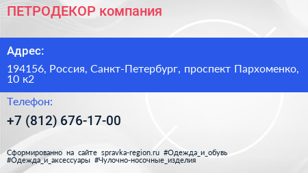 ПЕТРОДЕКОР, компания по адресу 194156, Россия, Санкт-Петербург, проспект Пархоменко, 10 к2 в дальнейшем Организация, размещена в следующих категориях:
