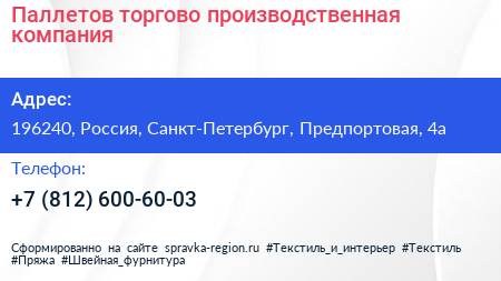 Паллетов, торгово-производственная компания по адресу 196240, Россия, Санкт-Петербург, Предпортовая, 4а в дальнейшем Организация, размещена в следующих категориях: