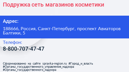 Подружка, сеть магазинов косметики по адресу 188666, Россия, Санкт-Петербург, проспект Авиаторов Балтики, 5 в дальнейшем Организация, размещена в следующих категориях: