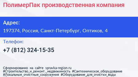 ПолимерПак, производственная компания по адресу 197374, Россия, Санкт-Петербург, Оптиков, 4 в дальнейшем Организация, размещена в следующих категориях: