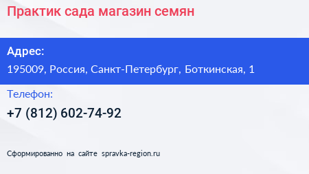 Практик сада, магазин семян по адресу 195009, Россия, Санкт-Петербург, Боткинская, 1 в дальнейшем Организация, размещена в следующих категориях: