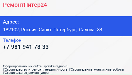РемонтПитер24 по адресу 192102, Россия, Санкт-Петербург, Салова, 34 в дальнейшем Организация, размещена в следующих категориях: