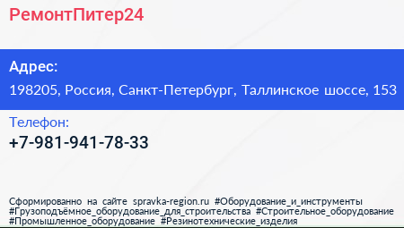 РемонтПитер24 по адресу 198205, Россия, Санкт-Петербург, Таллинское шоссе, 153 в дальнейшем Организация, размещена в следующих категориях: