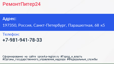 РемонтПитер24 по адресу 197350, Россия, Санкт-Петербург, Парашютная, 68 к5 в дальнейшем Организация, размещена в следующих категориях: