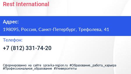 Rest International по адресу 198095, Россия, Санкт-Петербург, Трефолева, 41 в дальнейшем Организация, размещена в следующих категориях: