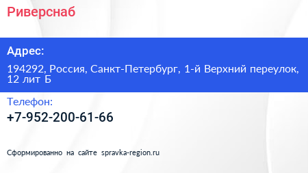 Риверснаб по адресу 194292, Россия, Санкт-Петербург, 1-й Верхний переулок, 12 лит Б в дальнейшем Организация, размещена в следующих категориях: