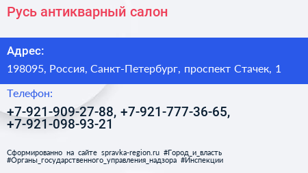 Русь, антикварный салон по адресу 198095, Россия, Санкт-Петербург, проспект Стачек, 1 в дальнейшем Организация, размещена в следующих категориях: