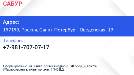 САБУР по адресу 197198, Россия, Санкт-Петербург, Введенская, 19 в дальнейшем Организация, размещена в следующих категориях: