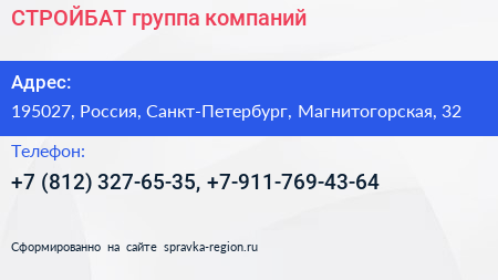 СТРОЙБАТ, группа компаний по адресу 195027, Россия, Санкт-Петербург, Магнитогорская, 32 в дальнейшем Организация, размещена в следующих категориях: