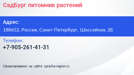 СадБург, питомник растений по адресу 188652, Россия, Санкт-Петербург, Шоссейная, 2Б в дальнейшем Организация, размещена в следующих категориях: